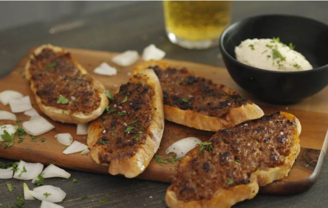 Meso posolite, dodajte mineralnu vodu i mljevenu papriku po želji. Dobro izmiješajte pa ostavite u hladnjaku da odstoji. Lepinje narežite na šnite kao kruh. Na svaku šnitu namažite sloj mesa, ne predebelo, i lagano ga utisnite. Pokrijte šnite sve do rubova.
