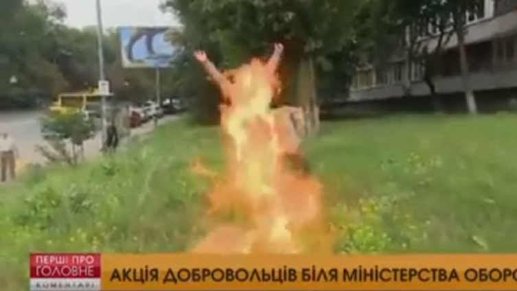 Ukrajinska televizija objavila je uznemirujuću snimku na kojoj se Serhii Ulianov polijeva benzinom i pali svoju uniformu u blizini sjedišta ministarstva odbrane u Kijevu.