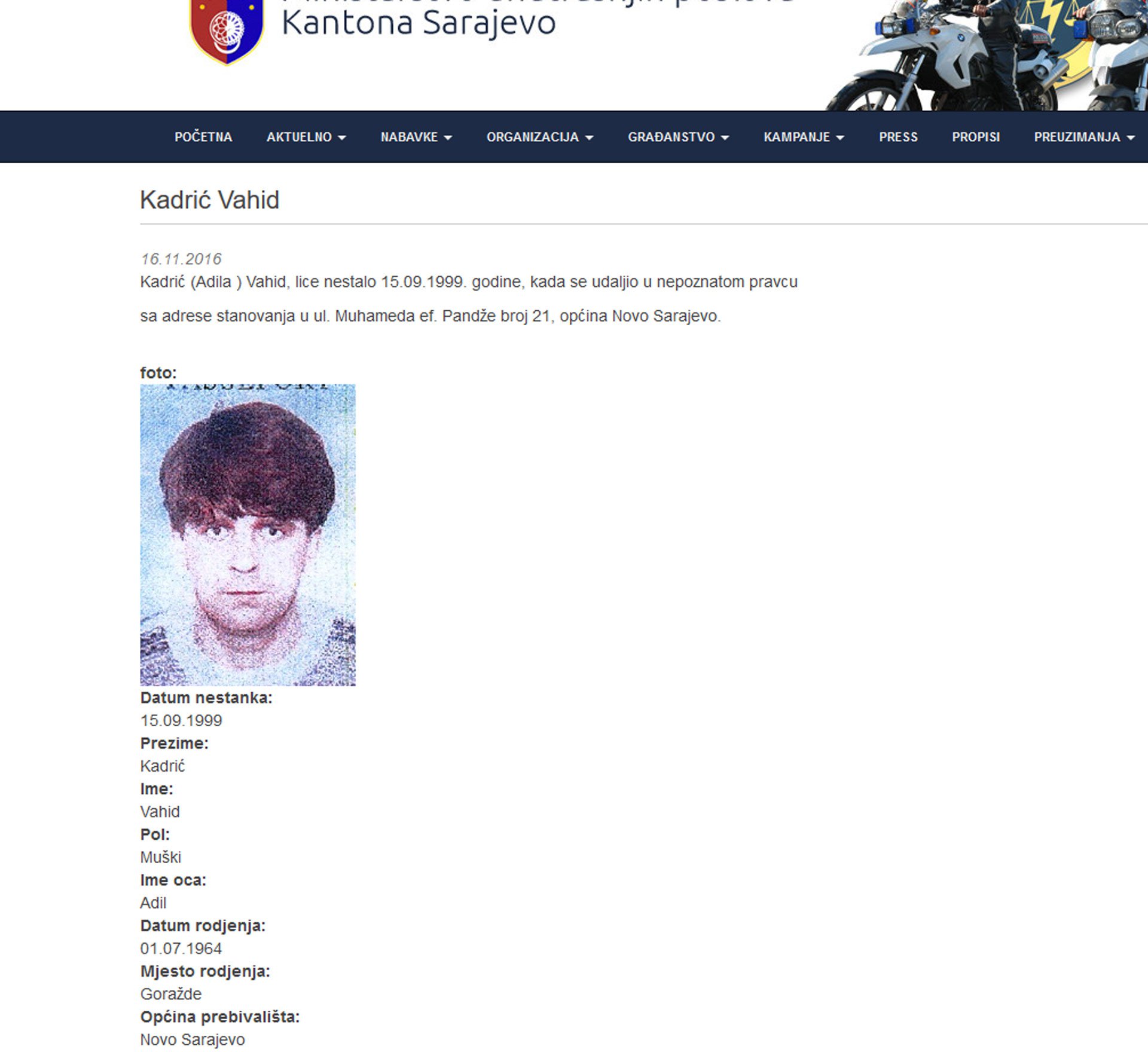 Članica porodice nestlaog Kadrića nam je kazala kako je porodica njegov nestanak prijavila u septembru 1999. godine, dakle, odmah po njegovom nestanku, međutim, MUP Kantona Sarajevo je ovu informaciju objavio tek jučer.
