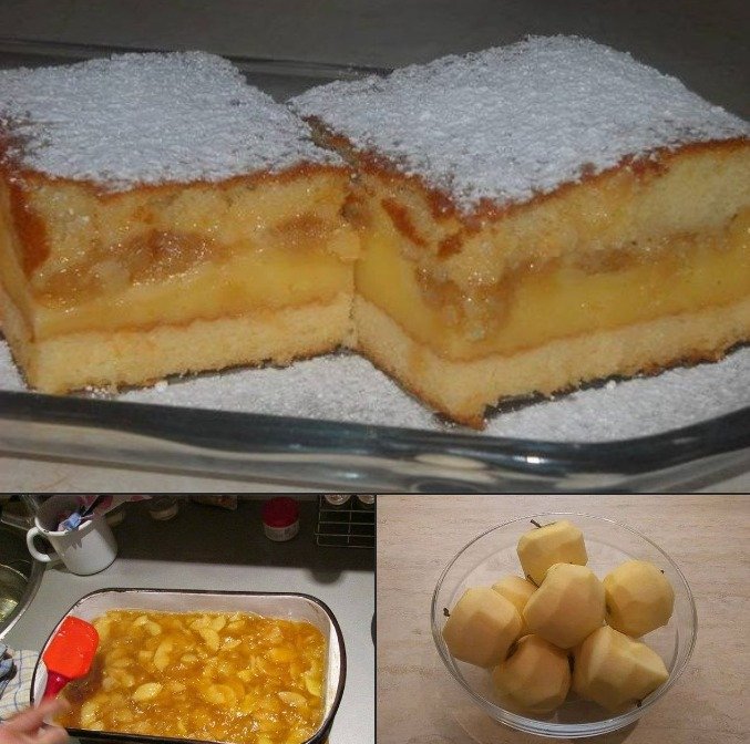Umutite mikserom jaja, secer i vanilin secer dok ne postanu penasta pa u tankom mlazu dodajte ulje, pa mleko i na kraju brasno pomesano sa praskom za pecivo.. Izrucite pola testa u podmazan pleh (mozete i u okrugli kalup za tortu br 26) pa pustite neka se pece oko 10 min dok kora malo ne pozuti.. Onda pleh izvadite van pa preko njega premazite puding kremu pa preko kreme fil od jabuka.. Sve to prekrijte ostatkom smese pa vratite u rernu jos 15 tak minuta da se ispece do kraja.. Pre posluzivanja kolac pospite prah secerom.. Pecite kolac na 200 stepeni..
