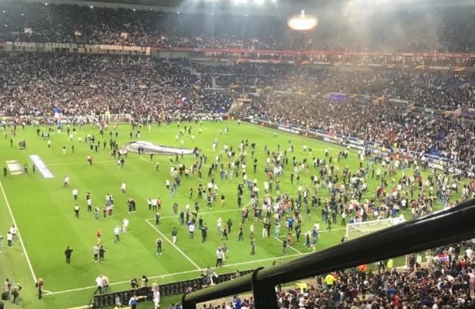 Na teren je izašao i situaciju pokušao smiriti predsjednik Olimpique Lyona Jean-Michel Aulas. Posredstvom razglasa je pozivao navijače da se vrate na tribine. Navijače s terena je na tribine vratila policija.