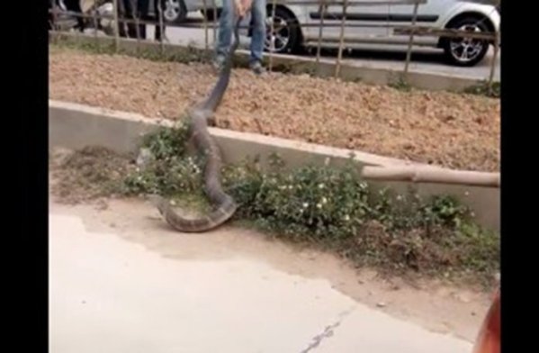 Kako je vidljivo na snimci, barem tri metra duga kobra se našla između dvije trake vrlo prometne ceste, zbog čega se nekoliko vozača zaustavilo.