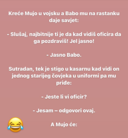 – Slušaj, najbitnije ti je da kad vidiš oficira da ga pozdraviš! Jel jasno!