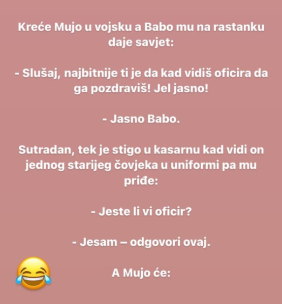 – Slušaj, najbitnije ti je da kad vidiš oficira da ga pozdraviš! Jel jasno!