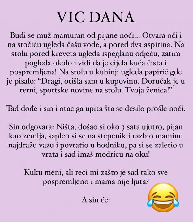 Budi se muž mamuran od pijane noći… Otvara oči i na stočiću ugleda čašu vode, a pored dva aspirina. Na stolu pored kreveta ugleda ispeglanu odjeću, zatim pogleda okolo i vidi da je cijela kuća čista i pospremljena! Na stolu u kuhinji ugleda papirić gde je pisalo: “Dragi, otišla sam u kupovinu. Doručak je u rerni, sportske novine na stolu. Tvoja ženica