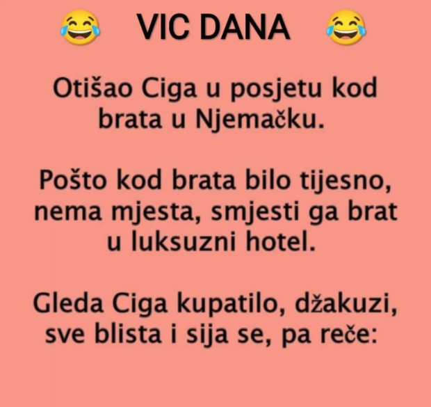Otišao Ciga u posjetu kod brata u Njemačku. Pošto kod brata bilo tijesno, nema mjesta, smjesti ga brat u luksuzni hotel.