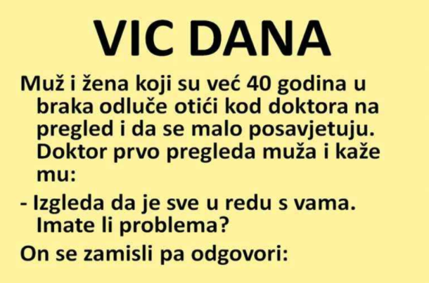 Muž i žena koji su već 40 godina u braka odluče otići kod doktora na pregled i da se malo posavjetuju. Doktor prvo pregleda muža i kaže mu: