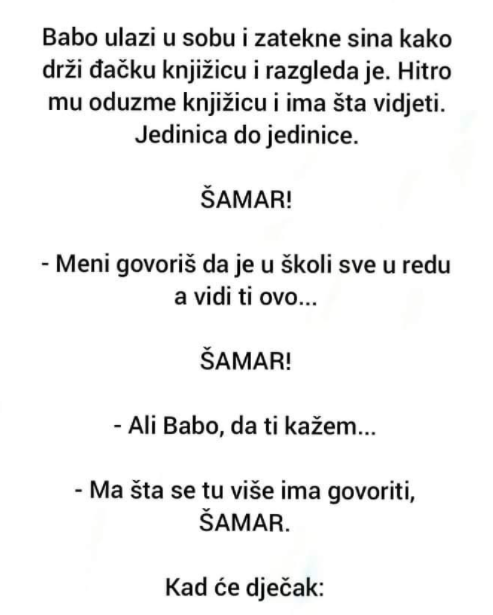 Babo ulazi u sobu i zatekne sina kako drži đačku knjižicu i razgleda je. Hitro mu oduzme knjižicu i ima šta vidjeti. Jedinica do jedinice.