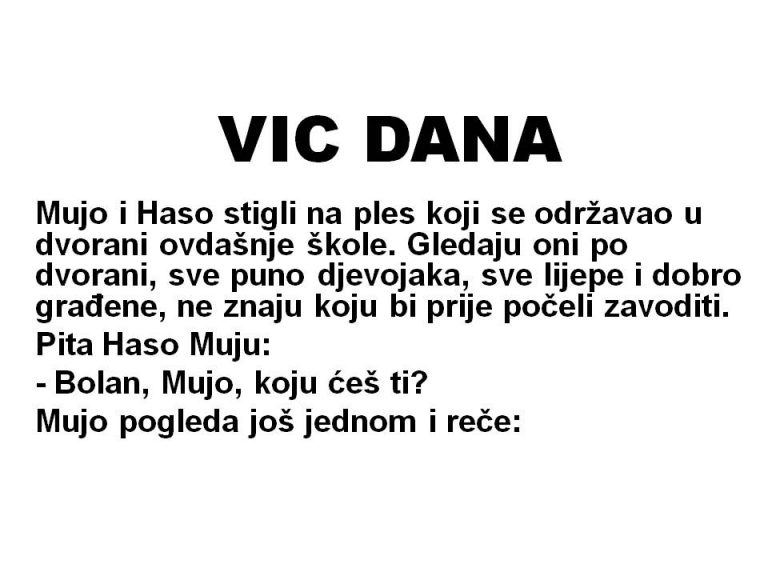 Mujo i Haso stigli na ples koji se održavao u dvorani ovdašnje škole. Gledaju oni po dvorani, sve puno djevojaka, sve lijepe i dobro građene, ne znaju koju bi prije počeli zavoditi.