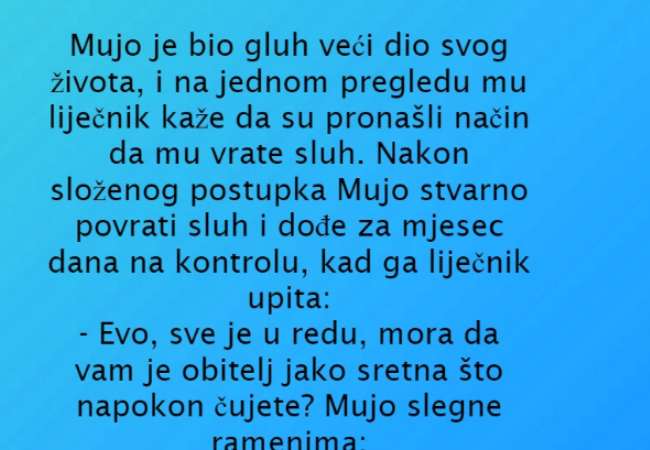 Nakon složenog postupka Mujo stvarno povrati sluh i dođe za mjesec dana na kontrolu, kad ga liječnik upita: