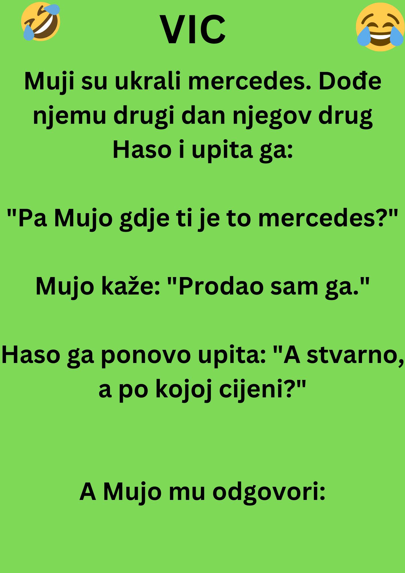 Muji su ukrali mercedes. Dođe njemu drugi dan njegov drug Haso i upita ga: