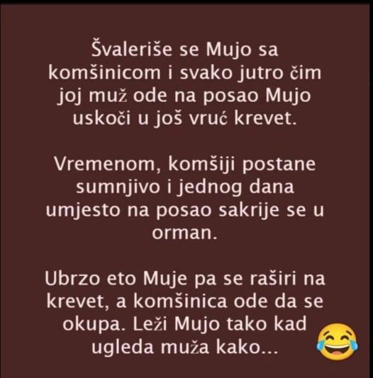 Ubrzo eto Muje pa se raširi na krevet, a komšinica ode da se okupa. Leži Mujo tako kad ugleda muža kako…