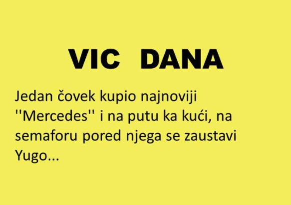 Jedan čovek kupio najnoviji ”Mercedes” i na putu ka kući, na semaforu pored njega se zaustavi Yugo.