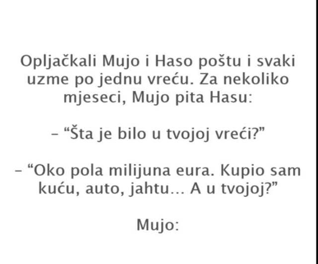Opljačkali Mujo i Haso poštu i svaki uzme po jednu vreću. Za nekoliko mjeseci, Mujo pita Hasu: