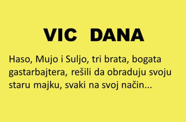 Haso, Mujo i Suljo, tri brata, bogata gastarbajtera, rešili da obraduju svoju staru majku, svaki na svoj način…
