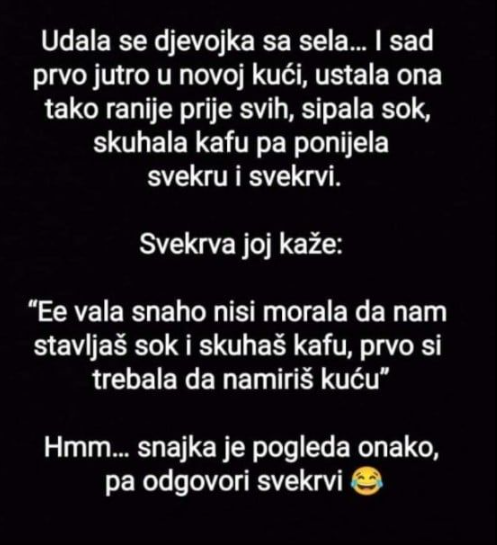 Udala se djevojka sa sela… I sad prvo jutro u novoj kući, ustala ona tako ranije prije svih, sipala sok, skuhala kafu pa ponijela svekru i svekrvi,a svekrva joj kaže: