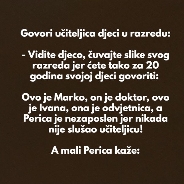 – Vidite djeco, čuvajte slike svog razreda jer ćete tako za 20 godina svojoj djeci govoriti: Ovo je Marko, on je doktor, ovo je Ivana, ona je odvjetnica, a Perica je nezaposlen jer nikada nije slušao učiteljicu!