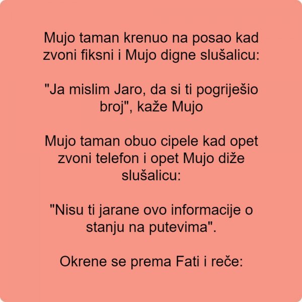 Mujo taman krenuo na posao kad zvoni fiksni i Mujo digne slušalicu: