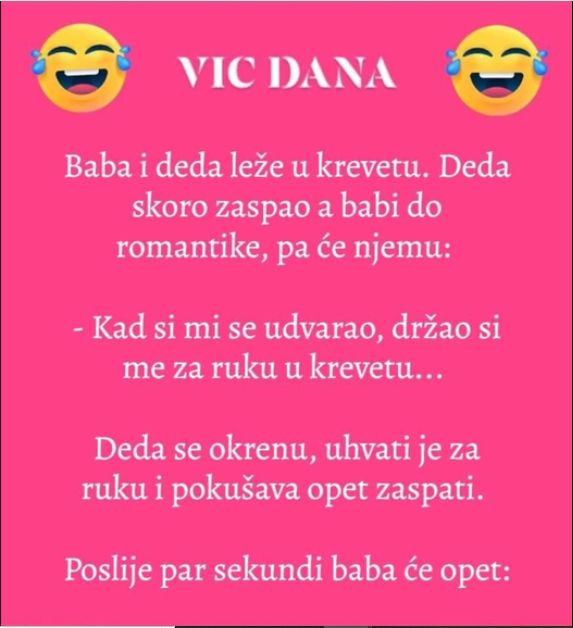 Baba i deda leže u krevetu. Deda skoro zaspao a babi do romantike, pa će njemu: