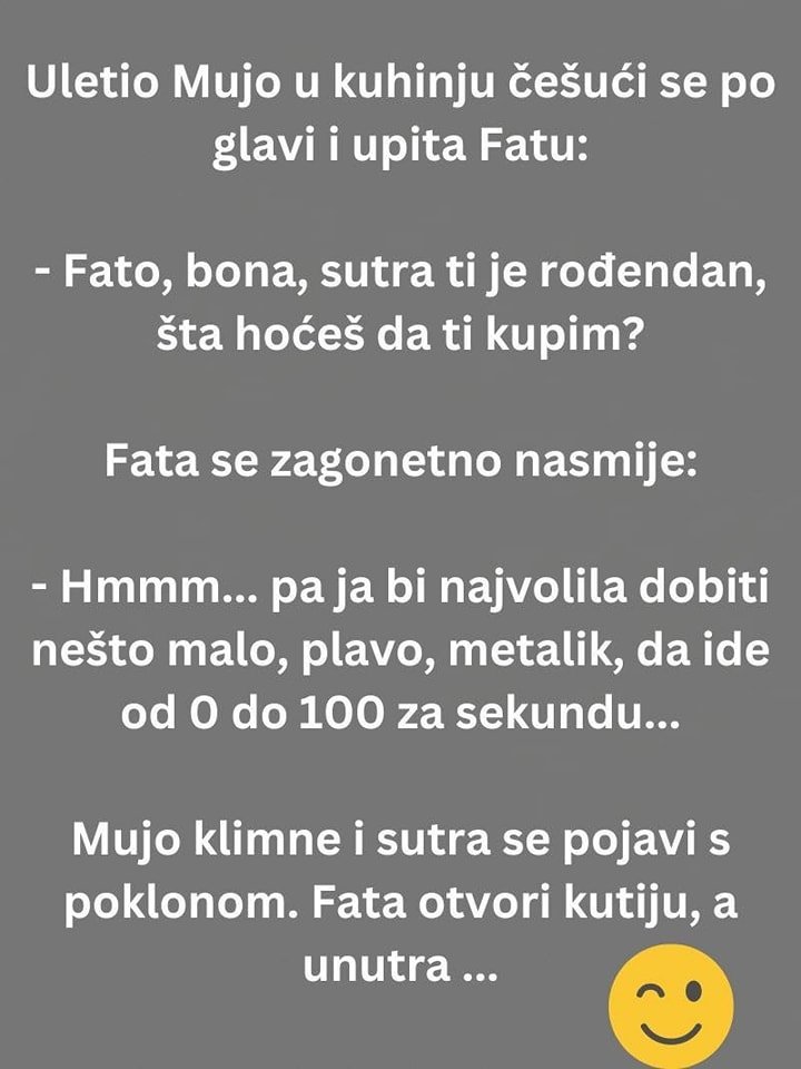 Mujo klimne i sutra se pojavi s poklonom. Fata otvori kutiju, a unutra – vaga, pa će ona bijesno: