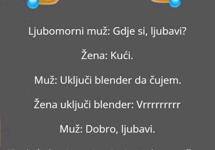 Sljedeći dan isto pitanje, isti odgovor, žena uključi blender: Vrrrrrr.