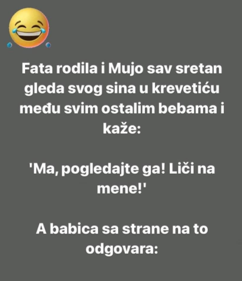 Fata je rodila i Mujo sav sretan gleda svog sina u krevetiću među svim ostalim bebama i kaže: