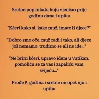 Sretne pop mladu koju vjenčao prije godinu dana i upita: