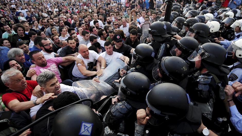 Okupljeni građani su, kako prenosi MIA, pokušali nasilno da probiju kordon policije i uđu u zgradu parlamenta uzvikujući: “Makedonija, ne damo ime”, pjevajući patriotske pjesme.