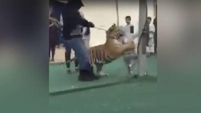 Snimak prikazuje tigra kojeg čovjek vodi na povocu kako bi zabavio ljude u otvorenom dijelu tržnice u gradu Sakakahu, na sjeverozapadu zemlje.