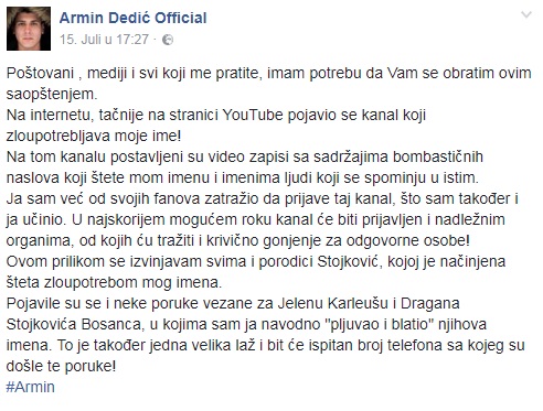 Ipak, nešto kasnije se oglasio i pravi Armin Dedić koji je bio na meti ljudi koji su mislili da je zaista on na svom Jutjub kanalu plasirao ovu vest.