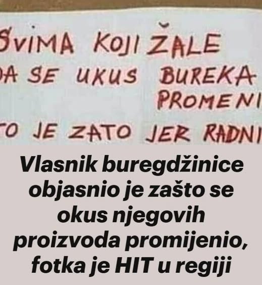 Nakon što je očito zaprimio određen broj prigovora na promijenjen okus bureka, vlasnik lokala iz Srbije gostima je porukom ispred lokala odlučio objasniti o čemu se radi. Tko ne bi imao razumijevanja za ovakvo objašnjenje? 😅