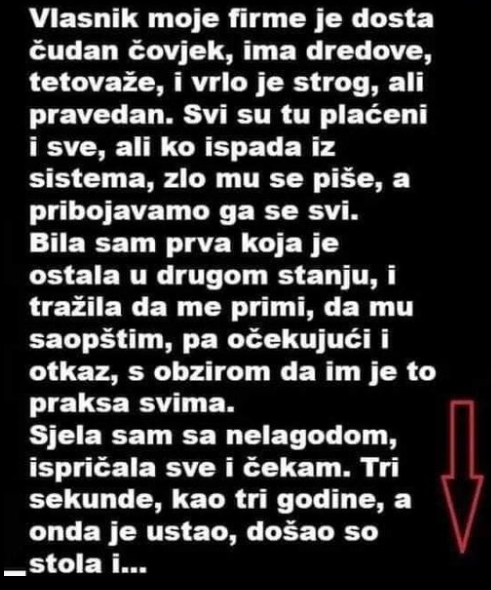 Bila sam prva koja je ostala u drugom stanju, i tražila da me primi, da mu saopštim, pa očekujući i otkaz, s obzirom da im je to praksa svima.