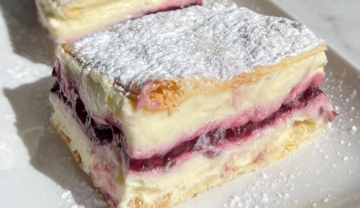 U pleh stavite jednu koru lisnatog tijesta i na nju polovicu kreme, zatim voćni sloj pa drugu polovicu kreme i na kraju drugu koru lisnatog tijesta.