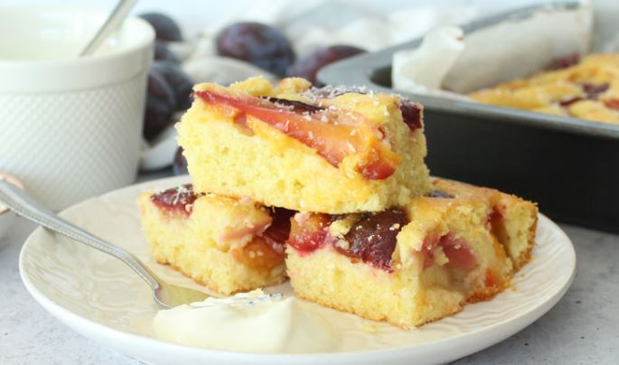 Kalup za kolače (24×32 cm) obložite masnim papirom ili namastite i pobrašnite. U kalup istresite pripremljenu smjesu, a preko smjese ravnomjerno rasporedite voće. Voće prethodno očistite i narežite na manje komade. Ukoliko je voće kiselo, prije nego ga stavite na smjesu pomiješajte ga s malo šećera.