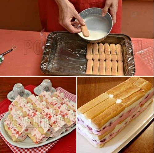 U pravougaonu posudu poređati red piškota umočenih u mleko, premazivati polovinom fila, prekriti redom piškota, naneti preostali fil i poravnati.