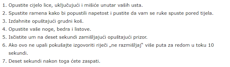 Kako kazu vjezba za svakog čovjeka je trajala otprilike 6 sedmcia dok nie u potpuosti ušao u tu rutinu čak kad bi popili velike količine kofeina oni bi za 2 minute zaspali bez ikakvih problema. Vjerujemo davas zanimaju koraci kako to postići dok ste otvorili ovaj članak, pa u nastavku vam sa njihove stranice direktno u cijelosti prenosimo korake: