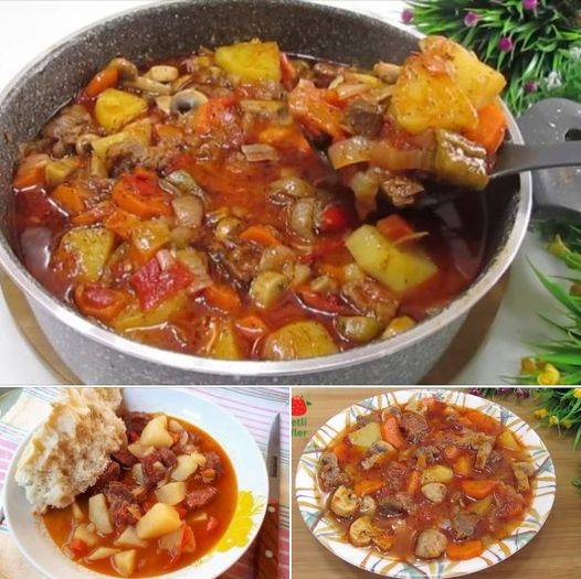 Iseckajte crni luk i šargarepu i isprežite na ulju. Zatim dodajte iseckanu crvenu i zelenu papriku i promešajte. Dinstajte dok ne omekša. Zatim dodajte secakne pečurke i promešajte. Poklopite i kuvajte dok ne omekša. Nakon toga dodajte krompir koji ste prethodno iseckali, kao i cele i oljuštene čenove belog luka. Lepo promešajte i poklopite. Kuvajte dok ne omekne, pa dodajte paradajz pastu i sos. Lepo promešajte i poklopite, pa kuvajte dok ne krene da vri. Zatim dodajte seckani paradajz, začinite po želji, pa dobro promešajte i kuvajte još par minuta, poklopljeno. U šerpi skuvajte meso po želji i iseckajte na kockice, pa dodajte u lonac i dobro promešajte. Sipajte i vodu i poklopite. Kad krene da ključa jelo je gotovo.
