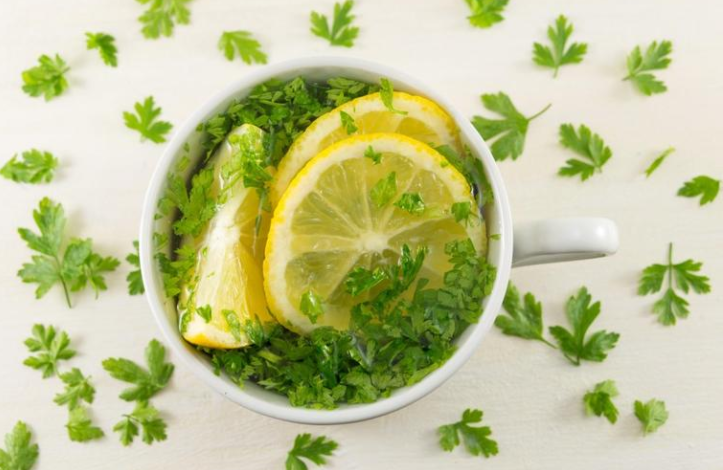 Iscedite sok iz limuna i iseckajte peršun. Stavite ih u šolju i preko prelijte vodu.