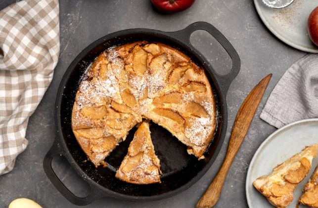 U tavi rastopite maslac i zatim dodajte šećer pa promiješajte. Zatim u tavu stavite jabuke i pirjajte na laganoj vatri 10-tak minuta. Nakon toga po želji ubacite cimet i promiješajte. Prelijte jabuke pripremljenom smjesom, lagano je poravnajte sa špatulom kako biste jabuke u potpunosti prekrili. Stavite poklopac na tavu i pecite kolač 10 minuta.