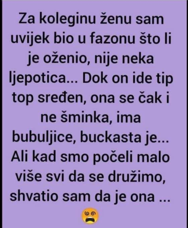 “Za koleginu ženu sam uvijek bio u fazonu što li je oženio, nije neka ljepotica.