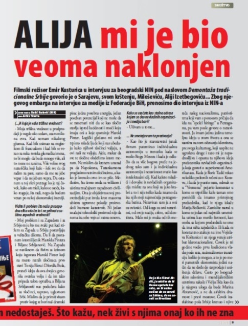Filmski režiser Emir Kusturica u intervjuu za beogradski NIN pod naslovom Demontaža tradicionalne Srbije govorio je o Sarajevu, svom krštenju, Miloševiću, Aliji Izetbegoviću… Zbog njegovog embarga na intervjue za medije iz Federacije BiH, prenosimo dio intervjua iz NIN-a.