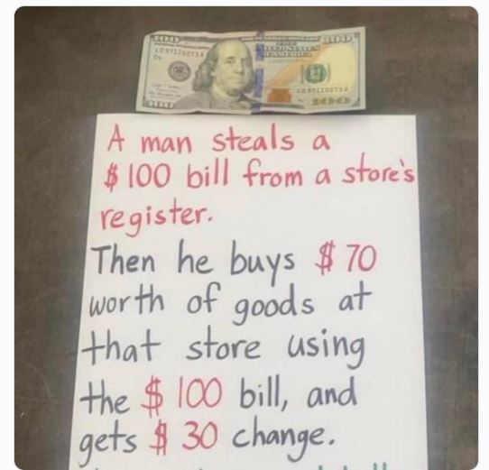 „Čovek je ukrao novčanicu od 100 dolara iz kase jedne prodavnice. Zatim je u toj prodavnici kupio robu u vrednosti od 70 dolara koristeći novčanicu od 100 dolara i dobio je 30 dolara kusura. Koliko je novca izgubila prodavnica?“ glasi zadatak koji je izazvao žustru raspravu u komentarima.