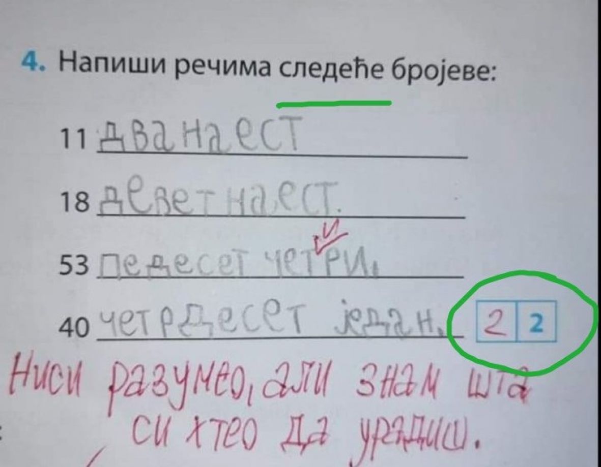 Zadatak je glasio “Napiši rečima sledeće brojeve”, a upravo je riječ “sledeće” ono što je zbunilo malog školarca, te je svaki zadati broj povećavao za jedan:
