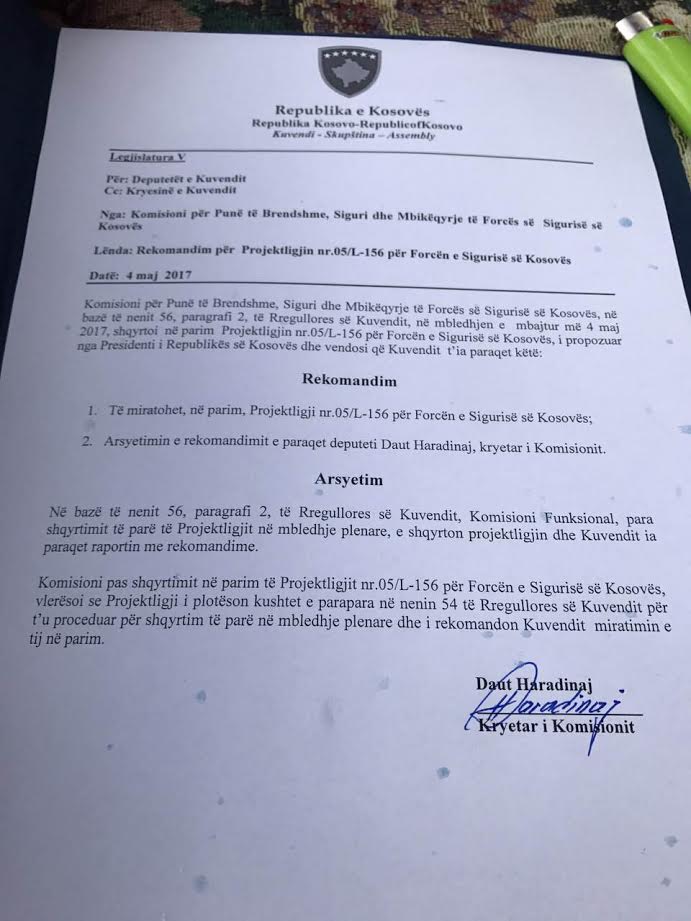 Nakon razmatranja Nacrta zakona o Kosovskim bezbjednosnim snagama, Komisija je zaključila da Nacrt zakona ispunjava uslove iz člana 54. Poslovnika o radu – da se nastavi sa prvim čitanjem na plenarnoj sjednici, a da se Skupštini, u načelu, preporuči usvajanje.