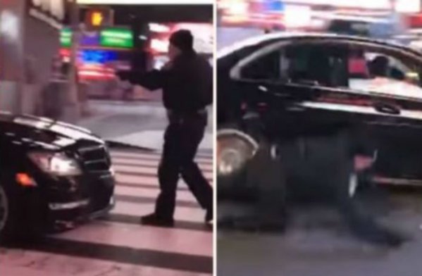 Nešto prije ponoći neimenovani policajac htio je legitimirati vozača crnog Mercedesa C63, kojeg je vidio kako u blizini Times Squarea sumanuto kruži automobilom na mjestu ostavljajući tragove kočenja, javlja New York Post.