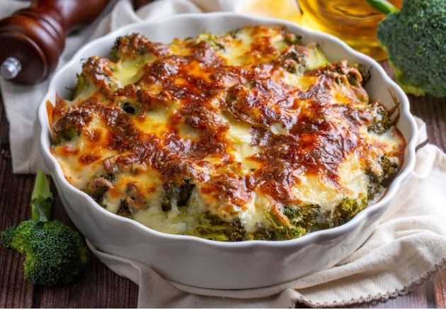 Zapečena piletina s brokulom i sirom – priprema:Brokulu očistite i odvojite na cvjetove. Stavite je kuhati pet minuta u kipuću posoljenu vodu.Za to vrijeme pileća prsa narežite kockice i prepržite ih na maslacu.
