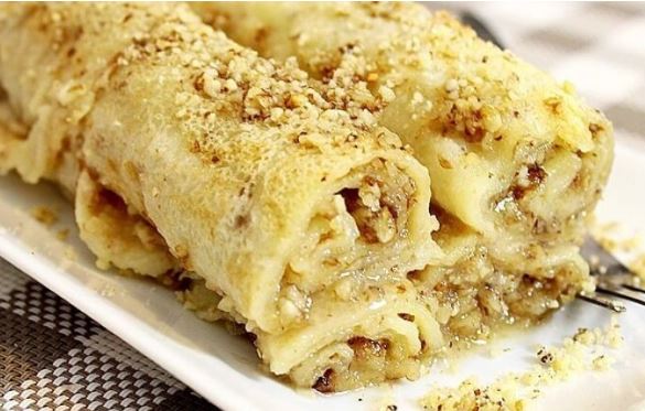 Pomešati orahe i šećer. Svaku palačinku posuti sa 2 kašike te mešavine. Urolati i ređati u posudu za pečenje. Ako se ređa u dva reda između posuti mešavinom oraha i šećera. Zaliti mlekom i ostaviti da palačinke malo upiju. Peći 15 minuta na temperaturi od 200 stepeni.