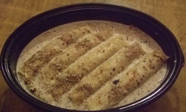 Palacinke urolovati i staviti red u keramicku, vatrostalnu ili neku drugu dublju tepsiju za pecenje. ja uvek koristim tepsijice koje su 28 cm duzine kako bi stavila tacno jednu palacinku po duzini i redjala jednu do druge. Stavite polovinu palacinki na dno.Potomih pospite sa tri kasike oraha i tri kasike secera.Stavite drugu polovinu urolovanih palacinki i opet pospite sa tri kasike secera i tri kasike oraha. Zalijte mlekom i ostavite da malo upiju.Pecite 15ak minuta na temperaturi od 200C. Samo da malo porumene, koliko da se zapeku odozgore.