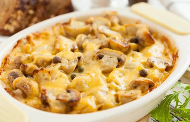 Smjesu umaka od gljiva uspite u 200 ml mlake vode pomiješane s vrhnjem pa zagrijavajte miješajući pjenjačom na srednjoj vatri dok umak ne zavri, kuhajte oko pet minuta. Pripremljeni umak prelijte preko sadržaja u posudama i pospite sirom. Pecite u pećnici zagrijanoj na 200 °C oko 15 minuta. Poslužite posuto vlascem.