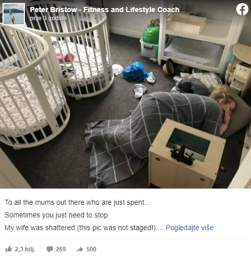 Novozelanđanin Piter Bristov, otac troje dece, objavio je na svom Fejsbuku potpuno realnu fotografiju koja možda najbolje opisuje majčinstvo.